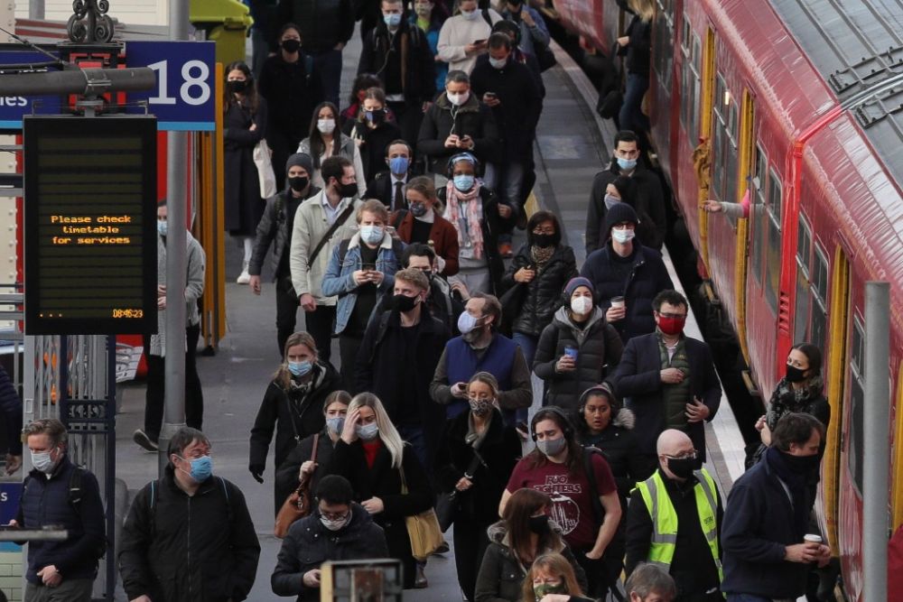 4月9日,通勤者在英国伦敦早高峰的滑铁卢车站内行走。(新华社发,蒂姆·爱尔兰摄)