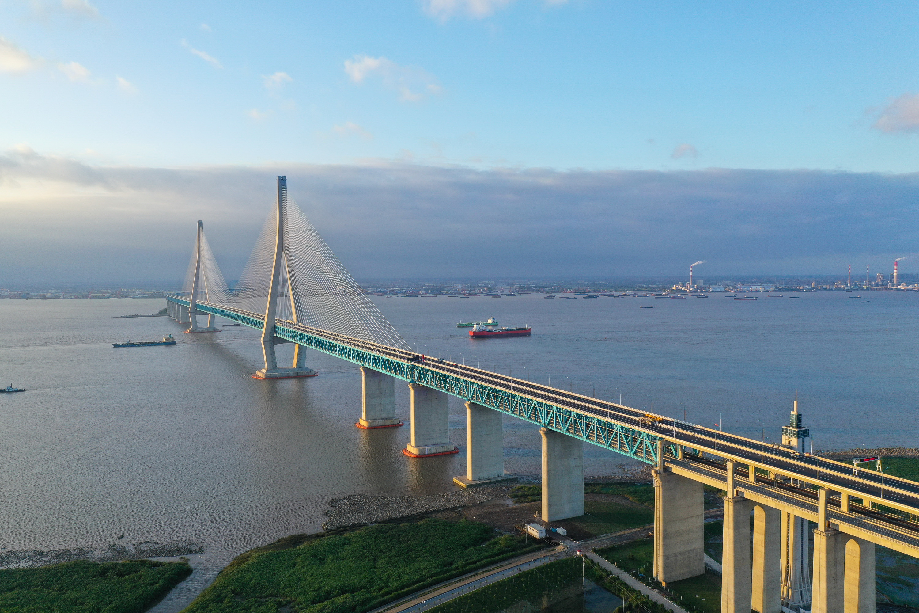 这是2020年6月29日使用无人机拍摄的沪苏通长江公铁大桥。新华社记者 季春鹏 摄
