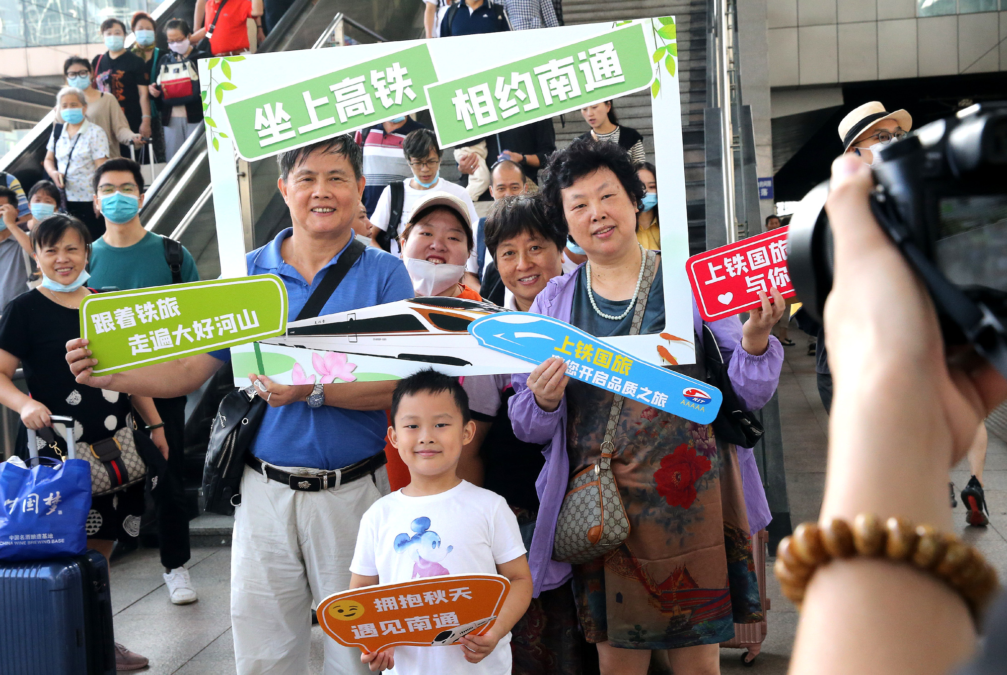 2020年9月12日,乘坐C3856次列车从上海经沪苏通铁路前往江苏南通的旅客在上海火车站合影留念。新华社记者 陈飞 摄