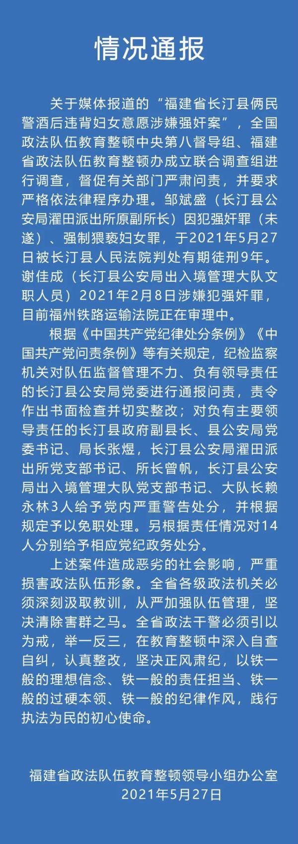 福建通报长汀两民警强奸妇女案:一人获刑9年、一人正在审理;副县长等3人被免职;14人被给予党纪政务处分>>