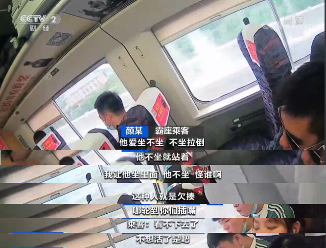 这位戴墨镜的男子颜某买的车票是靠窗位置,却一直占着别人靠过道的座位不肯让座。乘务员和列车安全员到达现场后,经多次劝说,颜某拒不让座。面对周围群众纷纷指责,颜某反而用语言威胁起了别人。