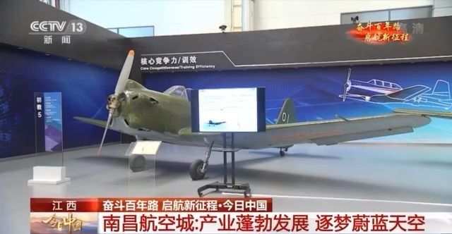 我们现在来到的是洪都集团展示馆。1954年,当时的国营洪都机械厂成功制造出新中国第一架飞机,就是我身边的这架初教-5。它的诞生标志着中国航空工业由修理走向制造的开端。