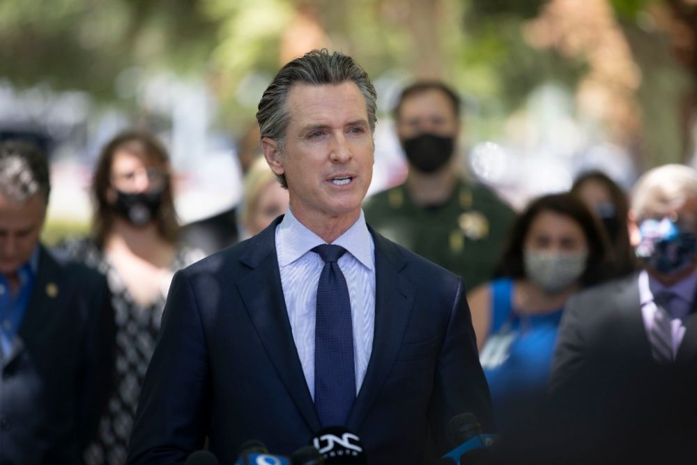 5月26日,美国加利福尼亚州州长纽瑟姆在圣何塞枪击事件现场附近对媒体讲话。(新华社发,李建国摄)