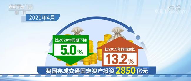 数据显示,4月,我国完成交通固定资产投资2850亿元,比2020年同期下降5%,比2019年同期增长13.2%。
