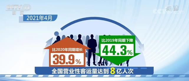 营业性客运量持续恢复。4月全国营业性客运量达到8亿人次,比2020年同期增长39.9%,比2019年同期下降44.3%。全国36个中心城市完成公共交通客运量49亿人次。