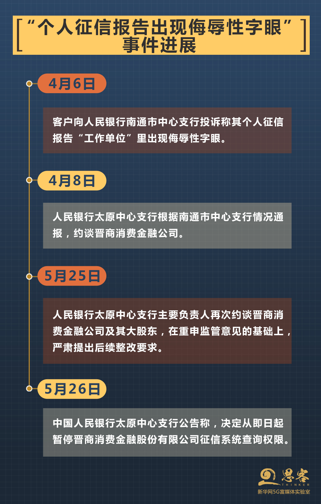 据媒体报道,江苏南通的房女士此前与晋商消费金融股份有限公司(下称晋商消金)有一笔个人消费贷款纠纷,该公司在上传征信信息时,将侮辱性字眼写入征信报告的“工作单位”一栏。虽然负责上传信息的晋商消金已删除不当字眼,但这一行为令网民愤怒,“征信报告怎么能瞎填”“不仅侮辱性极强,伤害性也极强”“称得上是‘经济性死亡’了”。