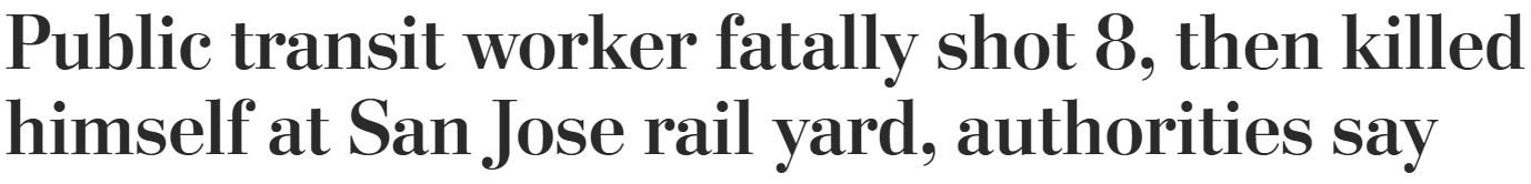 当地时间26日清晨6时30分许,加利福尼亚州圣何塞圣克拉拉谷交通管理局一处轻轨设施突起枪声,一名男性轻轨员工在射杀包括多位同事在内的8人后开枪自杀。