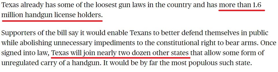 值得注意的是,共和党占优势的美国得克萨斯州议会当地时间24日刚刚批准一项允许该州居民在没有许可证的条件下携带手枪的法案。而在此之前,得州早已拥有美国最宽松的枪支法律,获得许可的手枪持有者超过160万。一旦新法案签署成法,得州将“加入其他20多个州的行列,但它将成为允许随意携带手枪的人口最多的州”。