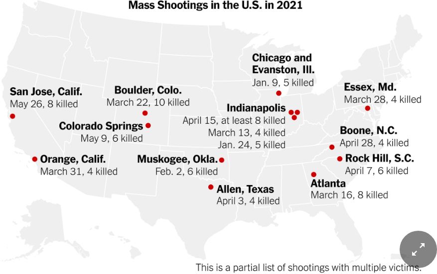 《纽约时报》援引GVA数据称,相对于2019年的417起和2020年的600多起,今年仅不到五个月时间,包括圣何塞枪击案在内,美国已至少发生232起大规模枪击事件(4人及以上遭枪击),其中,造成4人及以上死亡的“大规模枪杀”事件多达15起。