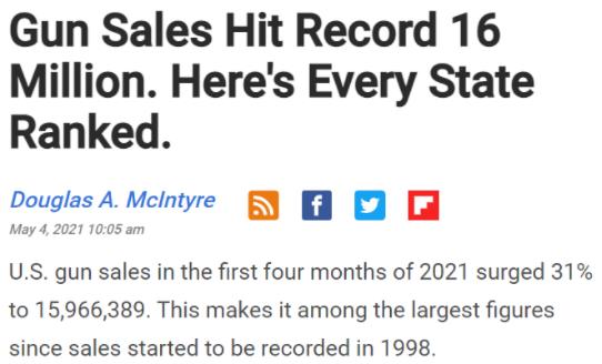 美国联邦调查局(FBI)本月早些时候发布的数据显示,今年前四个月全美枪支销售量达到近1600万支,比去年同期猛增31%,刷新了自1998年美国有枪支销售记录以来的最高纪录。
