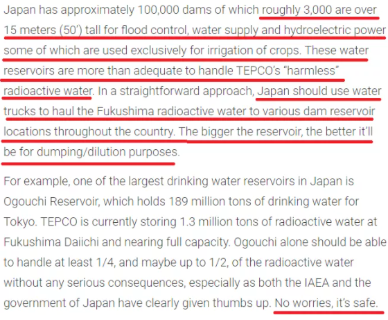 文章“建议”,这些水可以注入日本众多用于防洪、供水、发电和灌溉农作物的水库,“蓄水池越大,稀释的效果就越好”。而日本民众应该不会介意这么做,因为日本政府和美国已向世界保证,“别担心,很安全”。