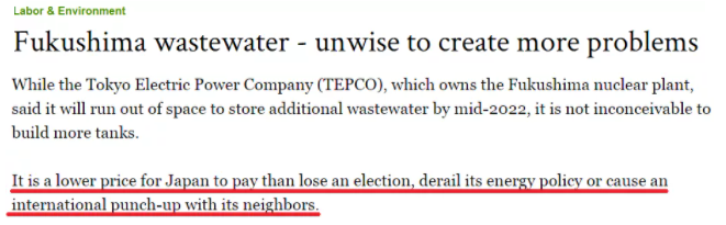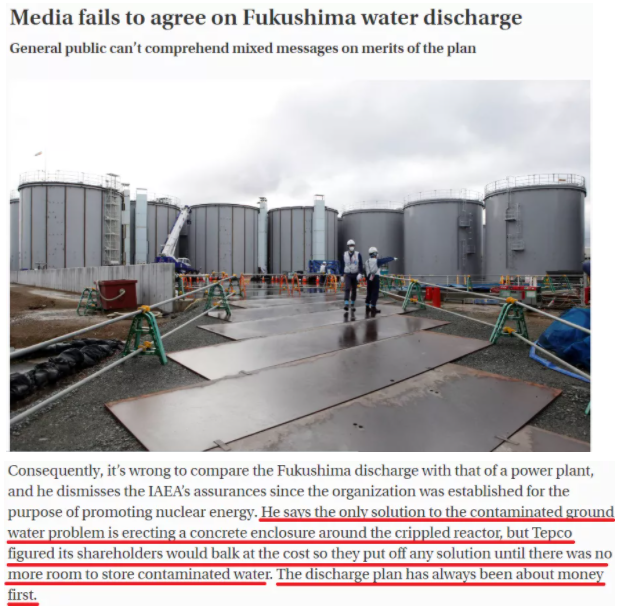 日本最大的英文报纸《日本时报》报道称,日本公众有充分理由不信任政府,特别是在东电应对不善、并以“片面”的理由坚称核污染水没有更多储存空间之后。