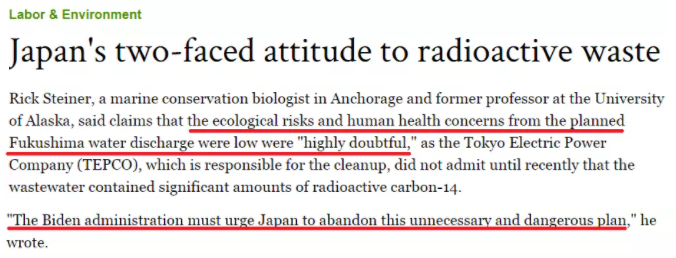 美国海洋专家、前阿拉斯加大学教授里克·施泰纳近期指出,日本方面有关核污染水排海对生态环境和人类健康威胁很小的说法“非常值得怀疑”,“拜登政府必须敦促日本放弃这个不必要且危险的计划”。