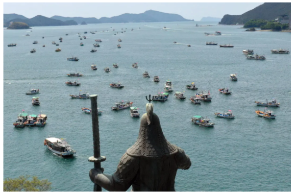 △当地时间4月26日,韩国200艘渔船聚集在抗倭名将像前,抗议日本做出核污染水排海决定。