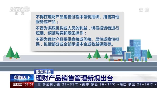 办法明确,理财产品销售机构及其销售人员在理财产品销售活动中,不得误导投资者购买与其风险承受能力不相匹配的理财产品;不得虚假宣传、片面宣传,夸大过往业绩,预测理财产品的投资业绩,或者出具、宣传理财产品预期收益率;不得将理财产品与存款或其他产品进行混同;不得在理财产品销售过程中强制捆绑、搭售其他服务或产品;不得为谋取机构或人员的利益,诱导投资者进行短期、频繁购买和赎回操作;不得为理财产品提供直接或间接、显性或隐性担保,包括部分或全部承诺本金或收益保障等。