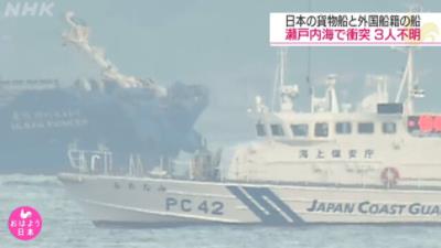 据日本海上自卫队方面的消息,两艘货船相撞发生在27日晚11:55,其中外籍货船载有大量化学品。在两船相撞发生大约2小时40分钟后,日本货船沉没。据当地消防部门称,日本货船上的12名船员中的9名已被救起,并及时送医,暂无生命危险,另外3人目前下落不明。