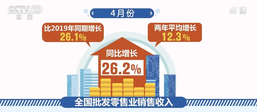 4月份,全国批发零售业销售收入同比增长26.2%,比2019年同期增长26.1%,两年平均增长12.3%。