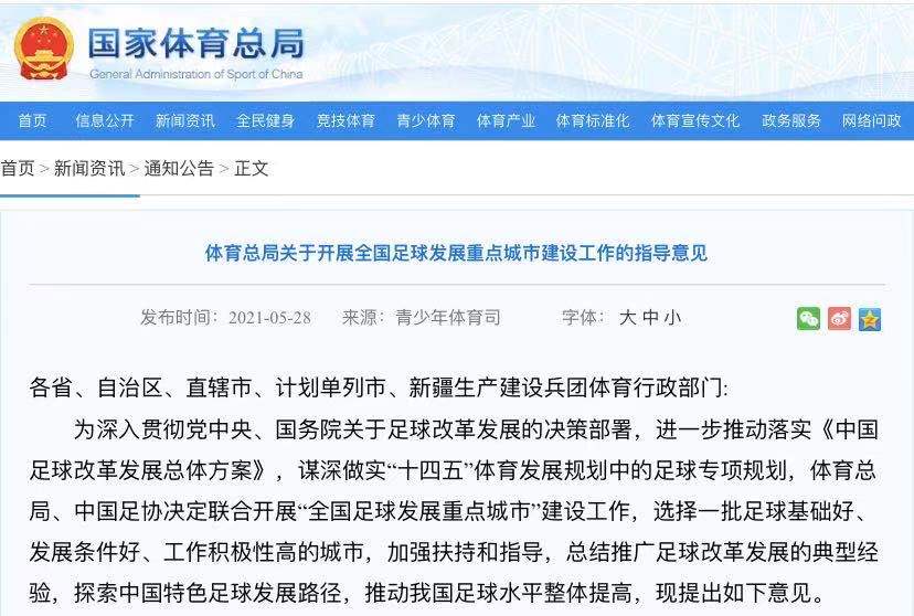 新华社北京5月28日电 28日,《体育总局关于开展全国足球发展重点城市建设工作的指导意见》(以下简称《指导意见》)公布。体育总局、中国足协决定联合开展“全国足球发展重点城市”建设工作,选择一批足球基础好、发展条件好、工作积极性高的城市,加强扶持和指导,总结推广足球改革发展的典型经验,探索中国特色足球发展路径。
