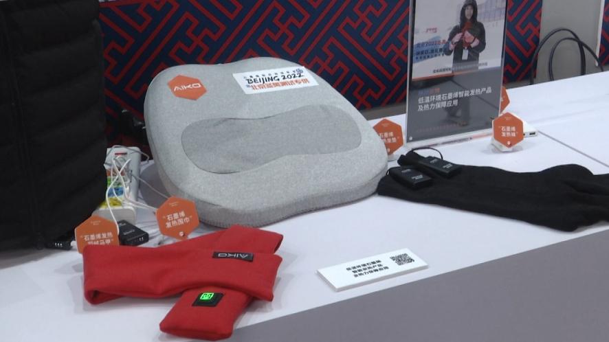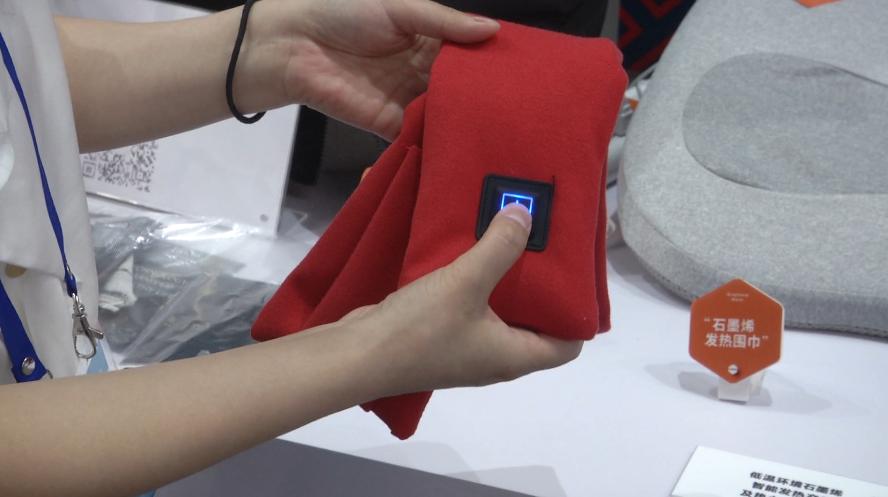 某科技公司工作人员:这款发热围巾是把研发的石墨烯发热纤维材料放到围巾里面,通过电子电路的安全控制,可以达到40、45、55摄氏度的三档温度。除了围巾之外,还有保暖设备,包括衣服、马甲、手套以及袜子等。