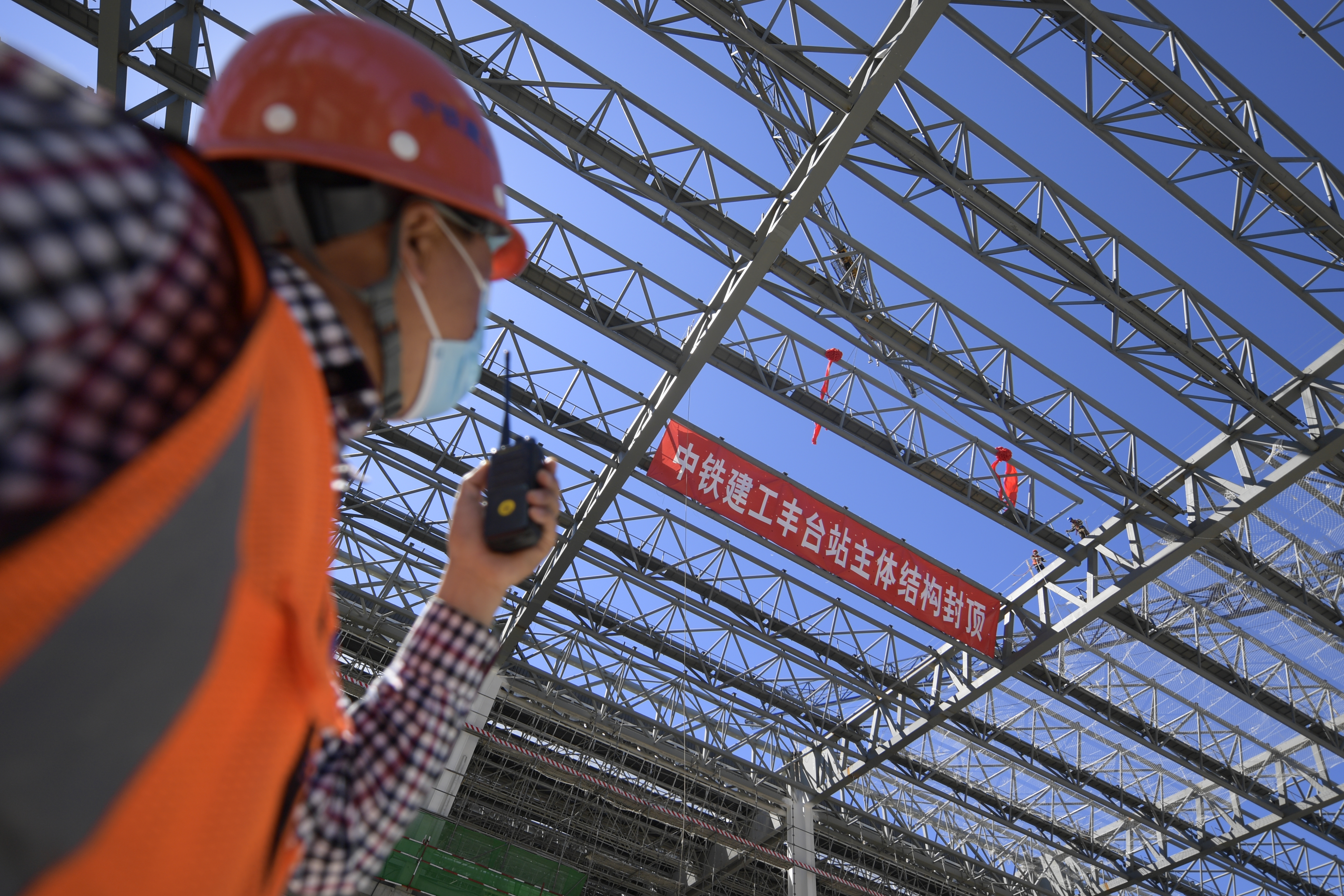 28日上午10时08分,随着最后一榀长19.9m、重6吨的钢次梁吊装就位,北京丰台站提前33天实现主体结构封顶。据中国铁路北京局集团有限公司介绍,北京丰台站将全面转入内外装修及机电安装阶段,预计年底具备开通条件。