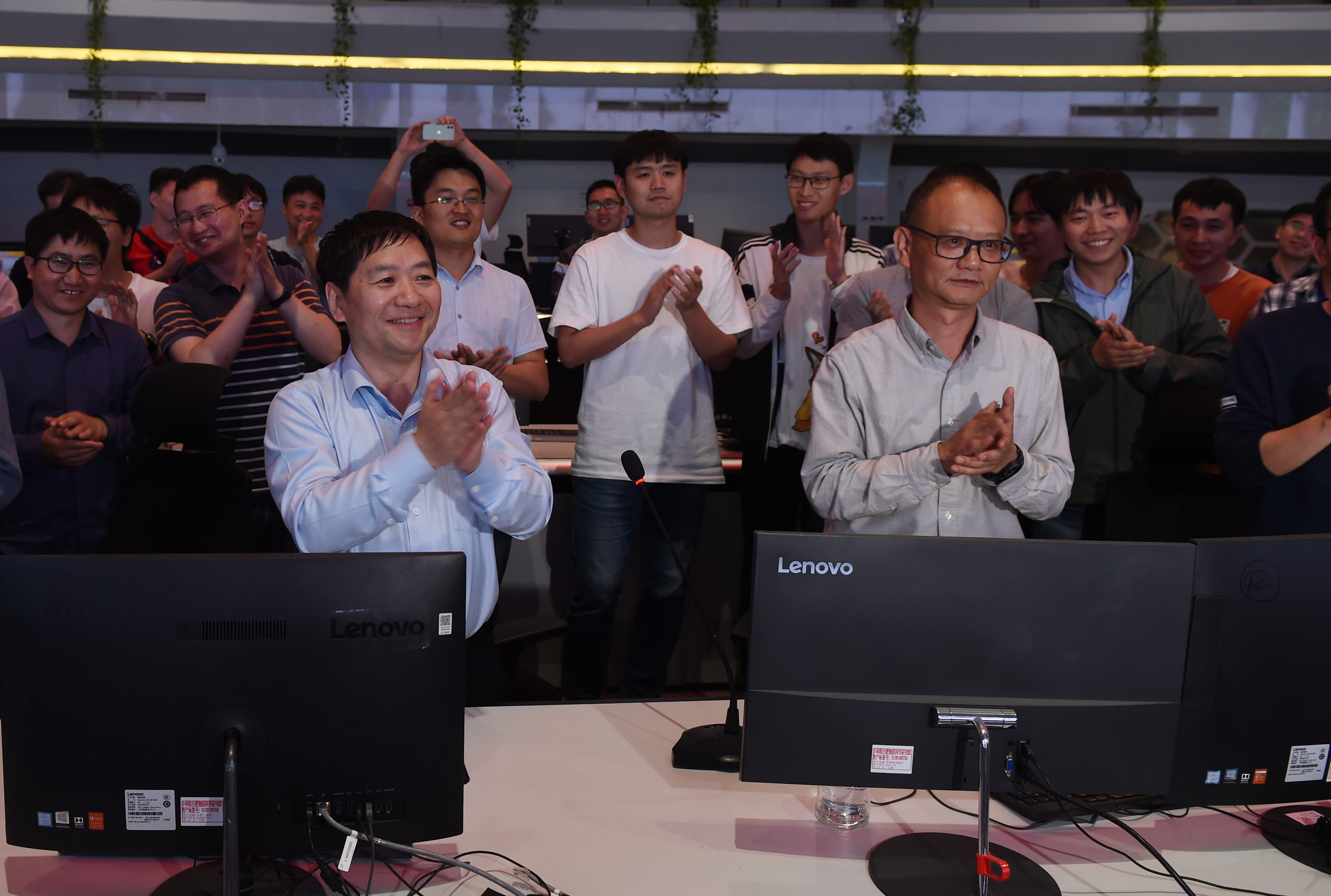 5月28日凌晨,EAST实验成功后宋云涛(前左)、龚先祖(前右)等科研人员起立庆祝 新华社记者周牧 摄