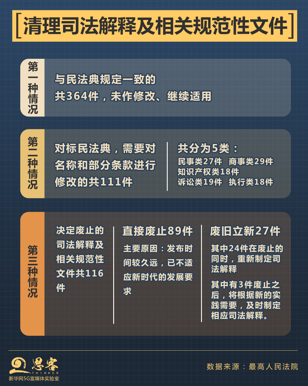 最高人民法院还对591件司法解释及相关规范性文件开展了一次大清理,其中111件予以修改、116件废止失效。这些工作,因应了司法实践之需、社会之需,为“切实实施民法典”做好了充足准备。