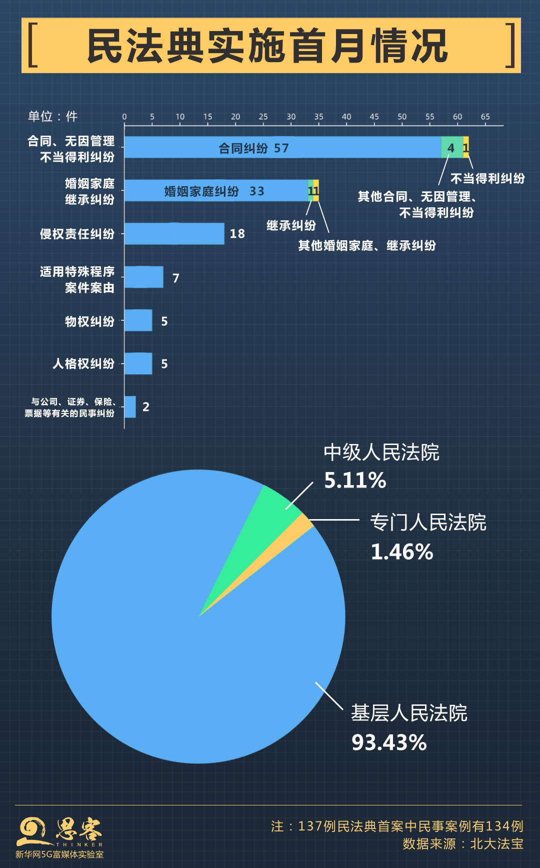 2021年1月1日起,《中华人民共和国民法典》正式施行。根据北大法宝数据统计,137例民法典各案由的“第一案”中,民事案例有134例,总占比为97.8%,涉及7种一级案由。其中,合同、无因管理、不当得利纠纷最多,有62例;其次是婚姻家庭、继承纠纷35例。