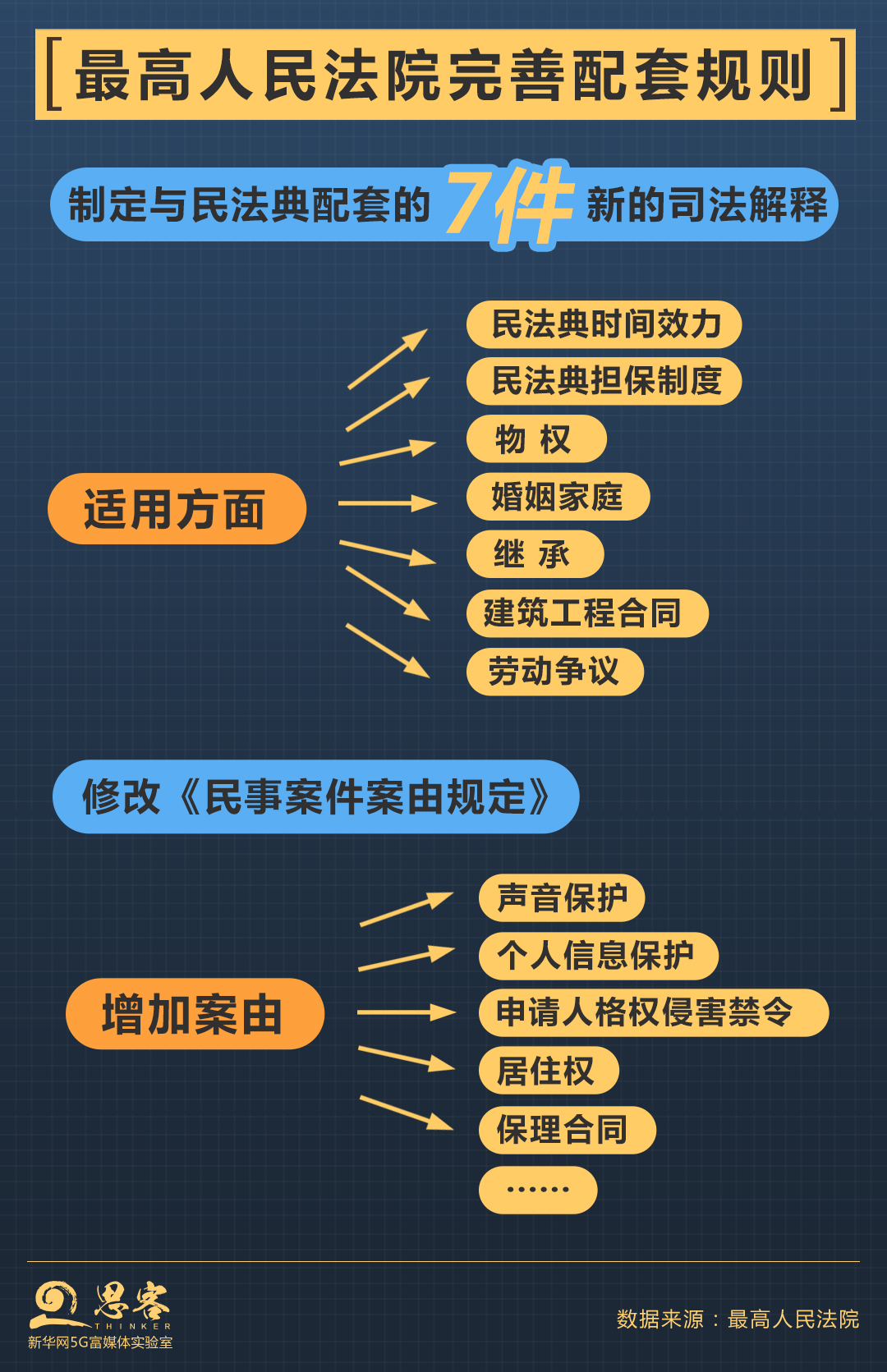 贯彻实施好民法典,首先需要完善配套规则,解决民法典施行后新旧法律和司法解释衔接适用问题。2020年12月30日,最高人民法院制定了与民法典配套的7件新的司法解释,涉及适用民法典的时间效力、担保制度、物权、婚姻家庭、继承、建筑工程合同、劳动争议等方面。