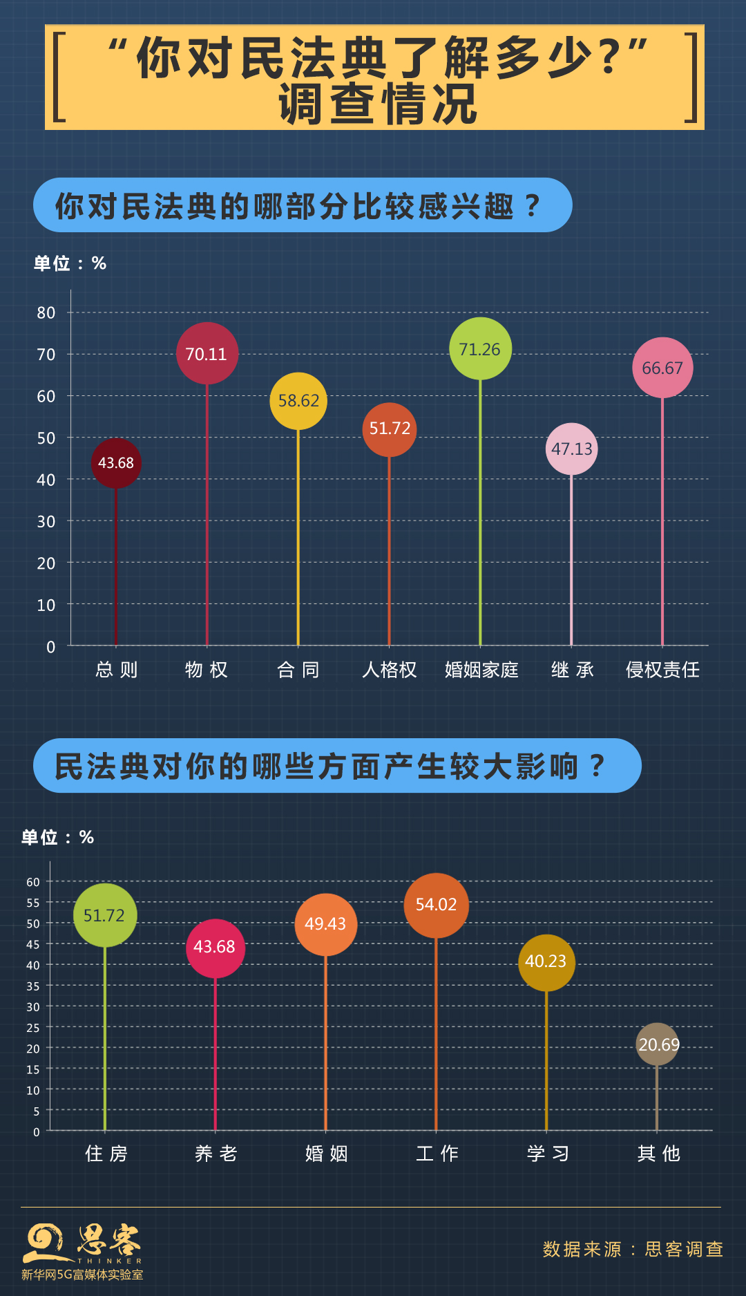 思客调查显示,民法典中婚姻、物权、侵权责任等相关内容较受关注。有71.26%的受访者对民法典“婚姻家庭”内容感兴趣,有受访者说“结婚之前我把民法典婚姻家庭篇从头到尾看了一遍”“离婚冷静期的关注度确实很高”。有70.11%的受访者更为关注民法典“物权”内容,“我们小区业委会依法为居民拿到电梯广告的收益”“居住权很重要”等留言时有出现。