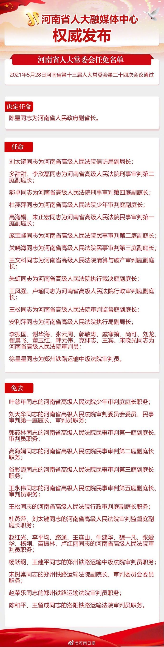 5月28日,河南省人大常委会发布任免名单:陈星同志任河南省副省长。