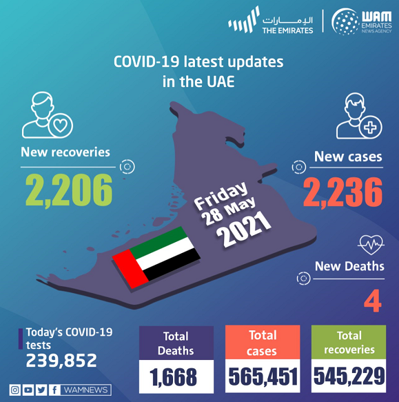 当地时间5月28日,阿联酋卫生和预防部通报,该国新增2236例新冠肺炎确诊病例,新增2206例治愈病例,新增4例死亡病例。截至28日,阿联酋境内新冠肺炎确诊病例累计达565451例,其中治愈病例545229例,死亡病例1668例。