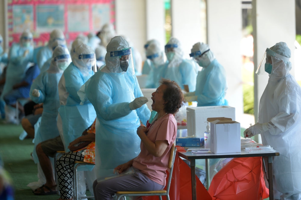 5月13日,泰国曼谷市民接受新冠病毒检测。(新华社发,拉亨摄)
