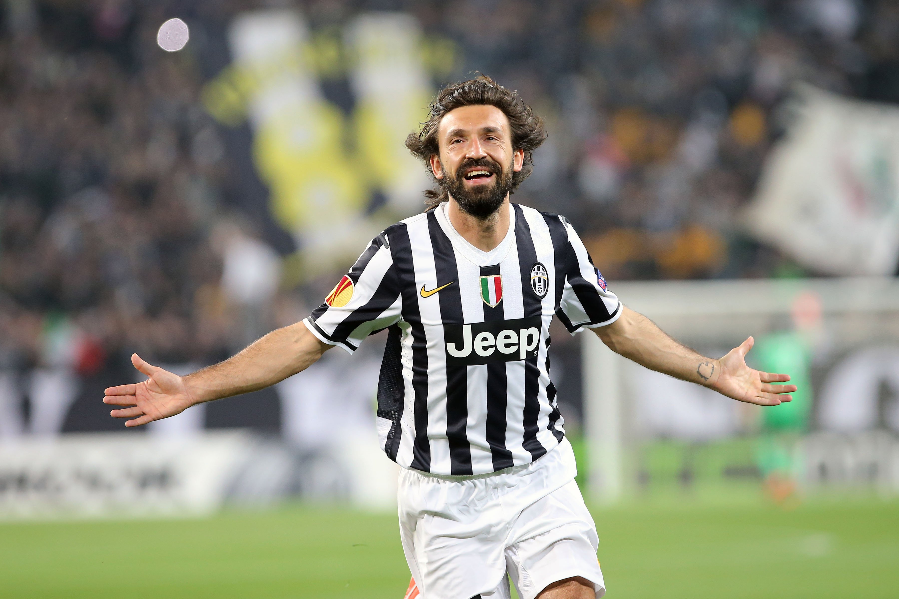 图为2014年4月10日,正效力于尤文图斯队的皮尔洛在欧罗巴联赛四分之一决赛中庆祝进球。新华社发(阿尔贝托·林格里亚摄)