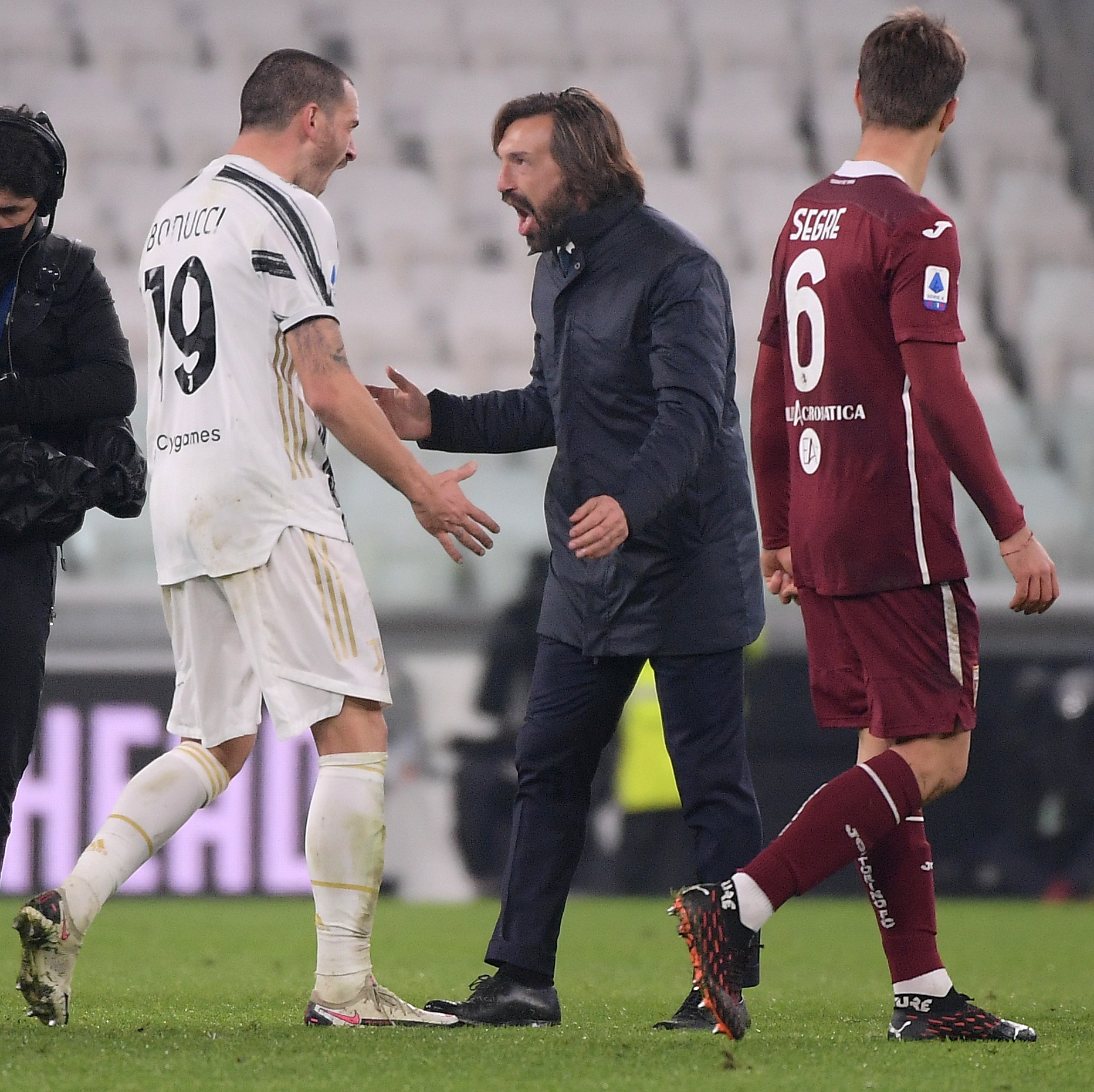 2020年12月5日,意甲第10轮,尤文图斯胜都灵,图为皮尔洛(右)和球员博努奇庆祝胜利。新华社发(费代里科·塔尔迪托 摄)