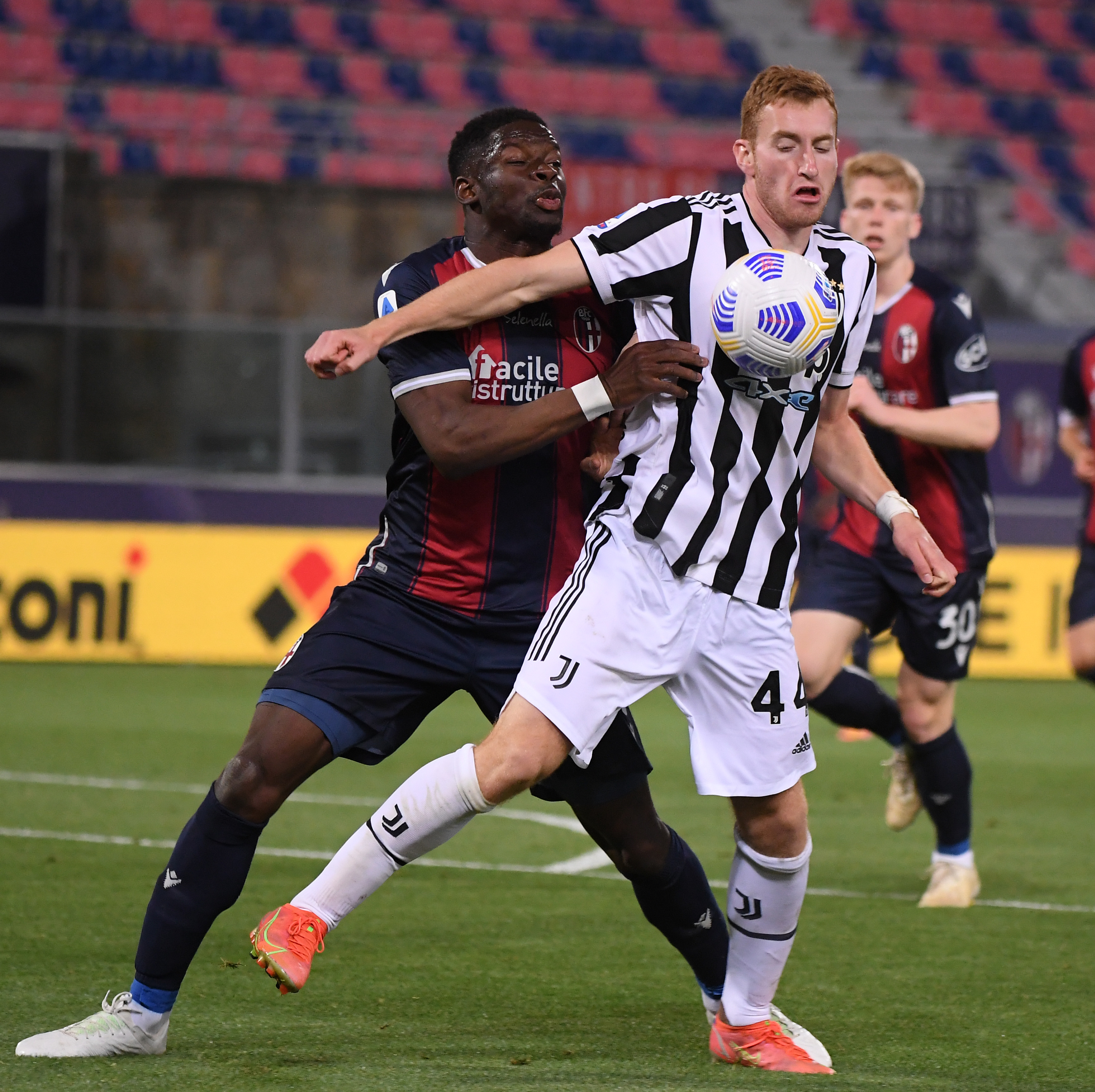 5月23日,尤文图斯队球员库卢塞夫斯基(右)与博洛尼亚队球员索马奥罗在比赛中拼抢。新华社发(费德里科·塔尔迪托摄)
