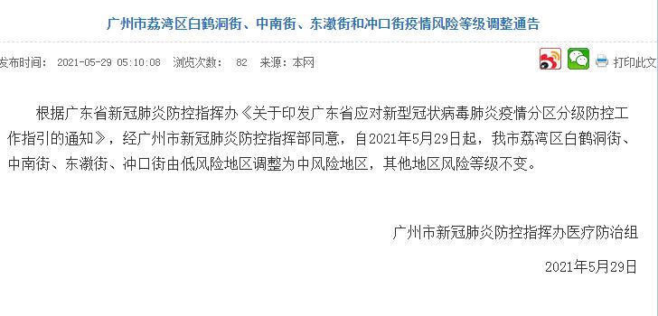 中新网5月29日电 29日,据广州市卫健委网站消息,根据广东省新冠肺炎防控指挥办《关于印发广东省应对新型冠状病毒肺炎疫情分区分级防控工作指引的通知》,经广州市新冠肺炎防控指挥部同意,自2021年5月29日起,广州市荔湾区白鹤洞街、中南街、东漖街、冲口街由低风险地区调整为中风险地区,其他地区风险等级不变。(完)