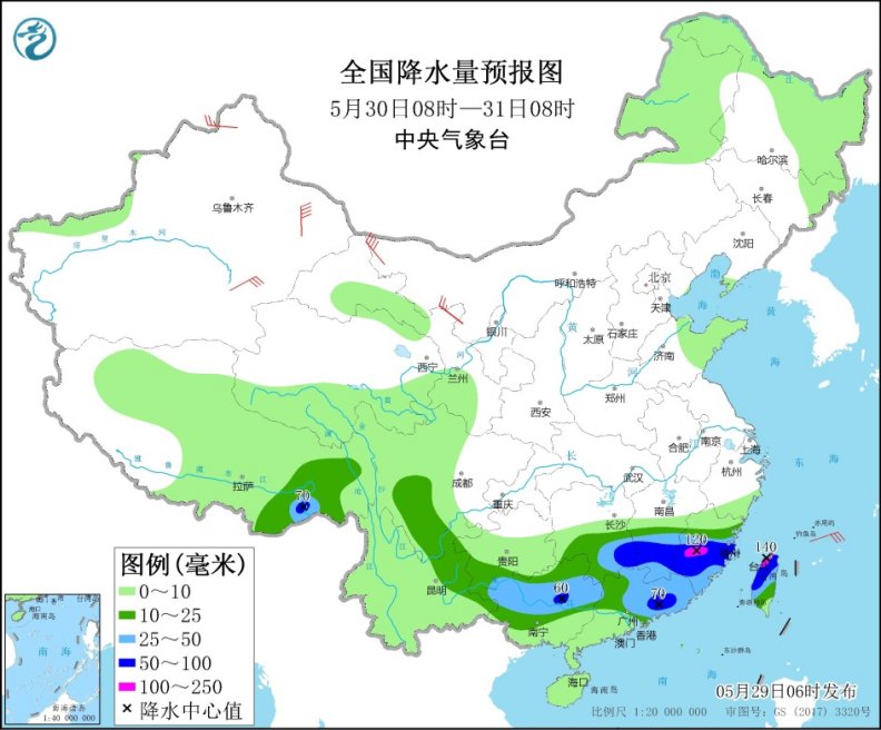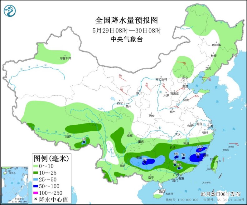 展望后期,6月1日至3日,江南、华南中北部及贵州等地有中到大雨,部分地区有暴雨,局部有大暴雨。
