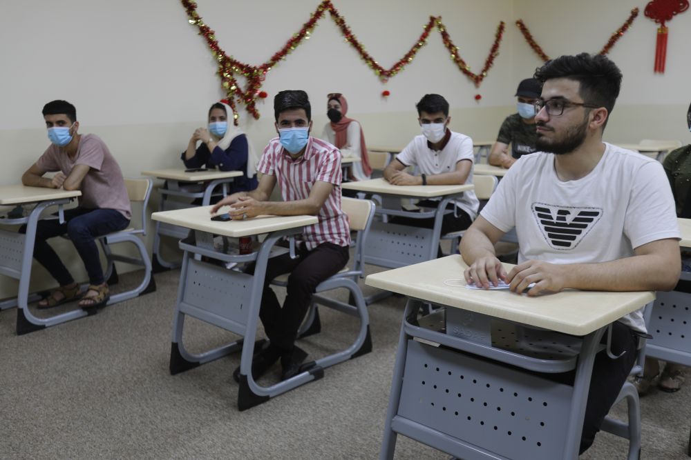 5月23日,伊拉克埃尔比勒市萨拉赫丁大学中文系的学生回到阔别已久的教室。新华社发