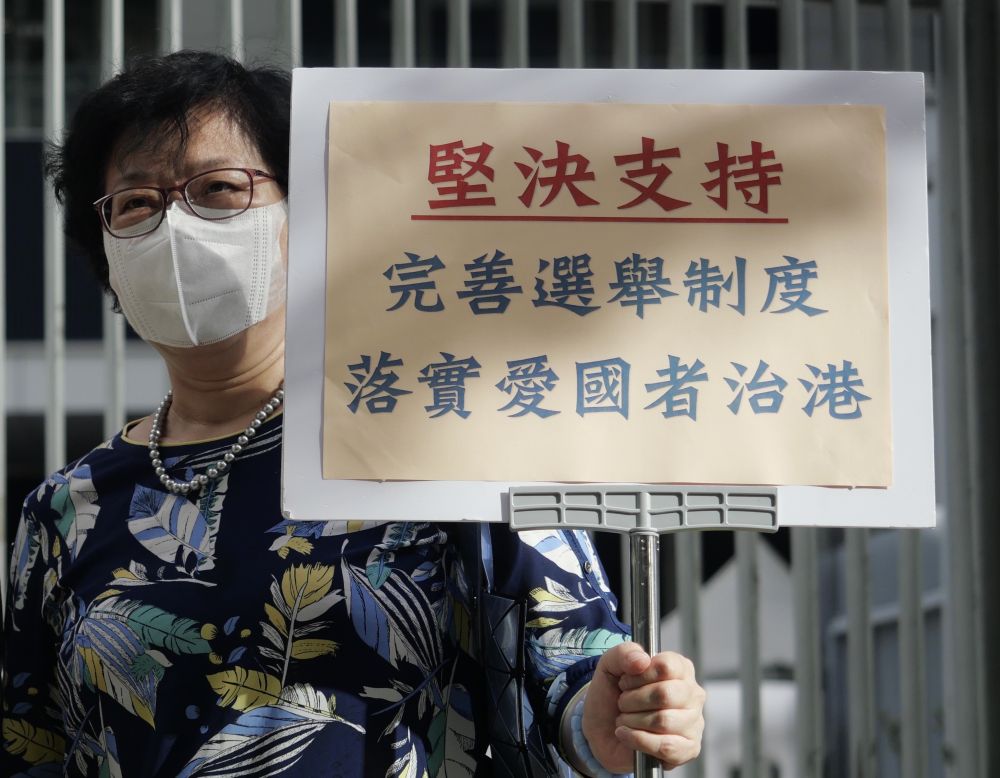 5月27日,在香港特区立法会外,香港市民欢迎条例草案通过。当日,香港特区立法会三读通过《2021年完善选举制度(综合修订)条例草案》,相关条例将于5月31日刊宪生效。(新华社记者王申摄)