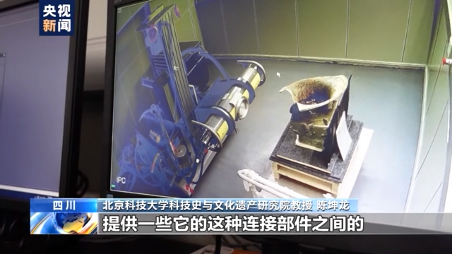 北京科技大学科技史与文化遗产研究院教授 陈坤龙:我们今天一会做一个X光,对它进行一个简单检测,因为有一些器物可能有一些隐含的像这样的裂纹,我们用肉眼观察可能观察不到。再一个就是X光同时也能够给我们提供一些这种连接部件之前的内部如何组合如何连接的这样的一些信息。
