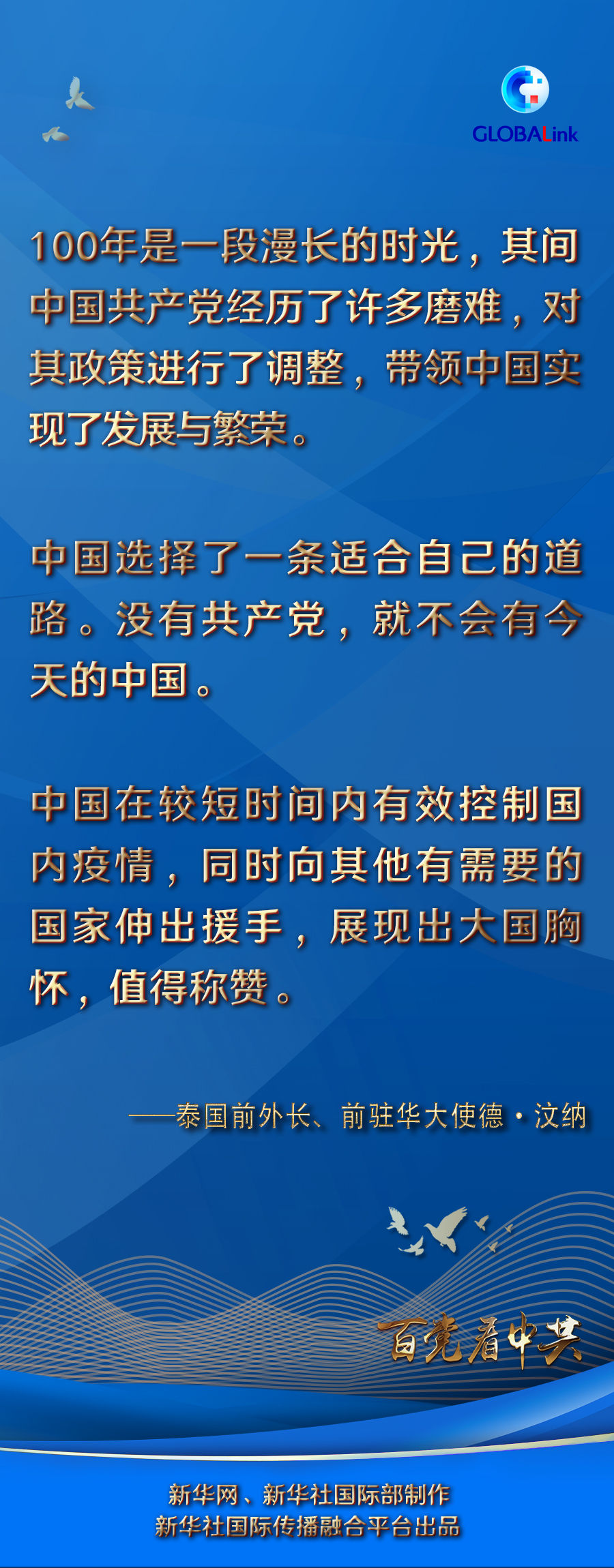 新华社曼谷5月29日电 “100年是一段漫长的时光,其间中国共产党经历了许多磨难,对其政策进行了调整,带领中国实现了发展与繁荣。”泰国前外长、前驻华大使德·汶纳日前在曼谷接受新华社专访时说。