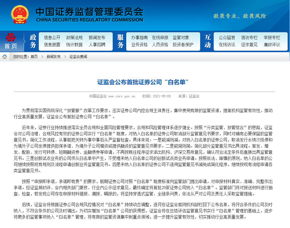 证监会表示,按照“分类监管、放管结合”的思路,证监会对公司治理、合规风控有效的证券公司实行“白名单”制度,对纳入白名单的证券公司取消部分监管意见书要求,同时对确有必要保留的监管意见书,简化工作流程,从事前把关转为事中事后从严监督检查。