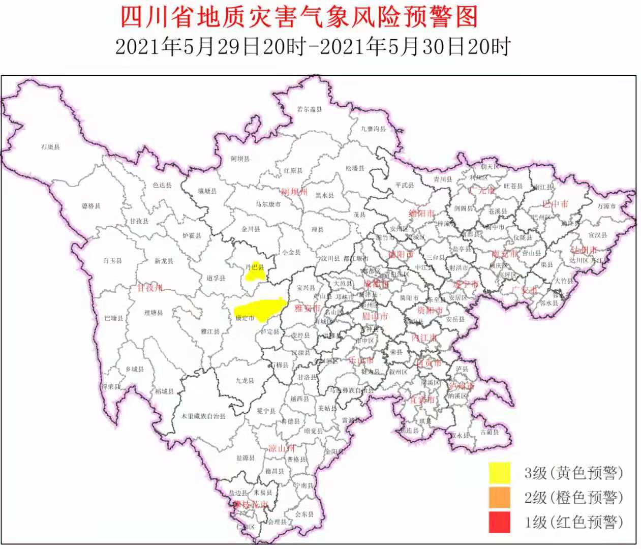 四川省地质灾害指挥部办公室5月29日16时30分发布消息,结合四川省气象台天气预报情况,5月29日20时~5月30日20时,四川发布地质灾害气象风险3级黄色预警,区域为甘孜州康定市、丹巴县。