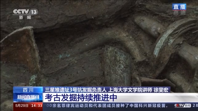 三星堆遗址3号坑发掘坑负责人 上海大学文学院讲师 徐斐宏:现在还是在稳步推进发掘工作,按部就班的进行清理和提取。下一步我们工作重点将从象牙转移到青铜器上面,会按顺序尽快把坑里的青铜器提取上来。