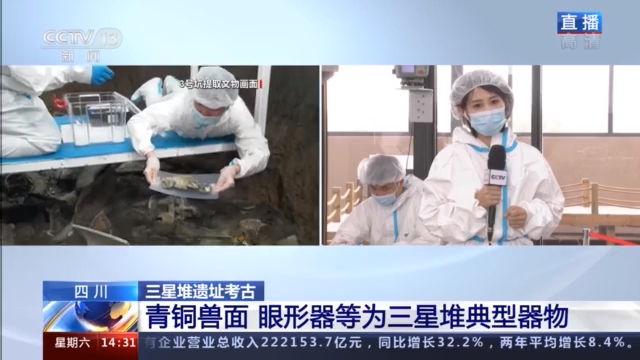 三星堆遗址3号坑发掘坑负责人、上海大学文学院讲师 徐斐宏:青铜兽面应该算三星堆文明比较独特的一个青铜器,之前在2号坑里面出现过9件,3号坑里面现在至少有2件,咱们上午提取了一件。