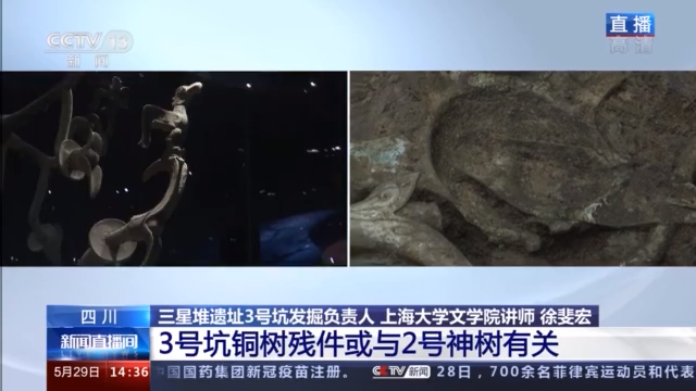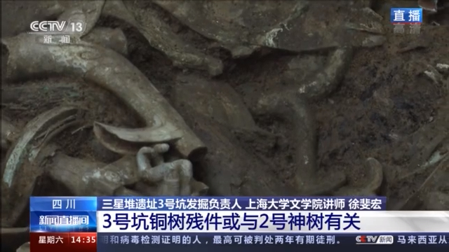 三星堆遗址3号坑发掘坑负责人、上海大学文学院讲师 徐斐宏:三星堆3号坑也有青铜神树,2号坑出现过两棵青铜神树,3号坑的神树跟2号坑的神树相似度非常高,甚至我们怀疑它与2号坑的神树能对起来。如果能证明它与2号坑的神树是同一个个体的话,我们的研究将会有很大的突破。