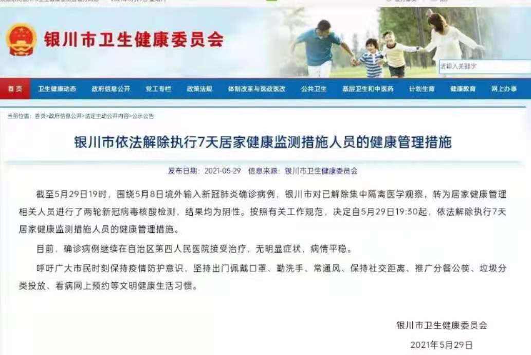 记者从宁夏银川市卫健委了解到,截至5月29日19时,围绕宁夏5月8日境外输入新冠肺炎确诊病例,银川市对已解除集中隔离医学观察,转为居家健康管理相关人员进行了两轮新冠病毒核酸检测,结果均为阴性。按照有关工作规范,决定自5月29日19时30分起,依法解除执行7天居家健康监测措施人员的健康管理措施。