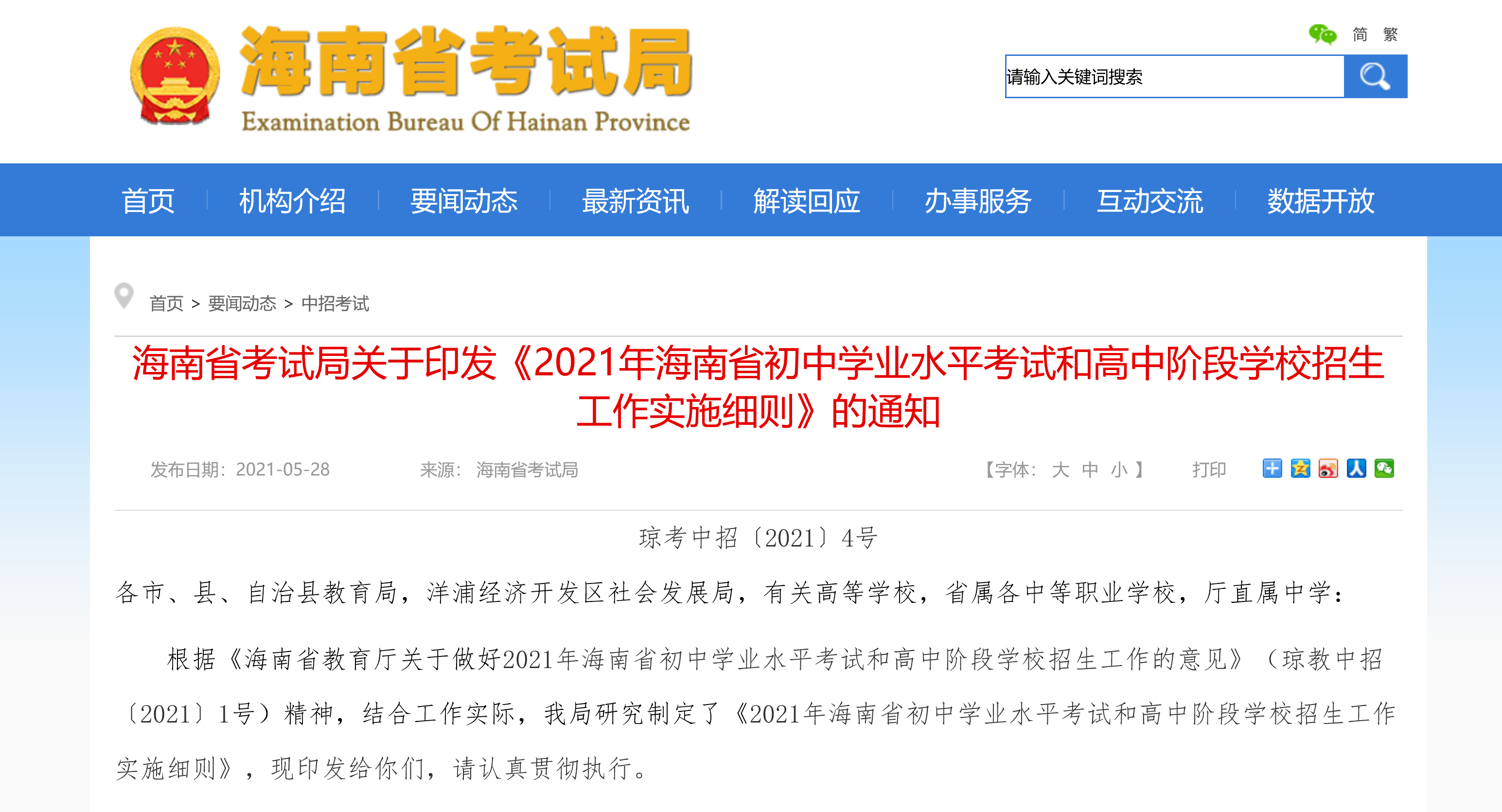 5月28日,海南省考试局发布《2021年海南省初中学业水平考试和高中阶段学校招生工作实施细则》的通知,学业水平考试海南省统一考试时间为6月25日—27日,2021年高中阶段学校招生志愿设提前批、第一批、第二批和第三批共四个批次,于6月28日起填报志愿。