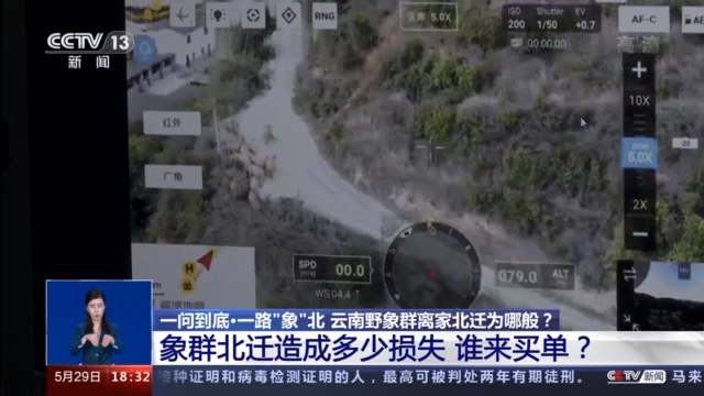 工作人员使用无人机监测象群行踪,发现今天也就是5月29日,象群仍在云南省玉溪市峨山县境内逗留,距离昆明市晋宁区不足50公里,距昆明城区约100公里。