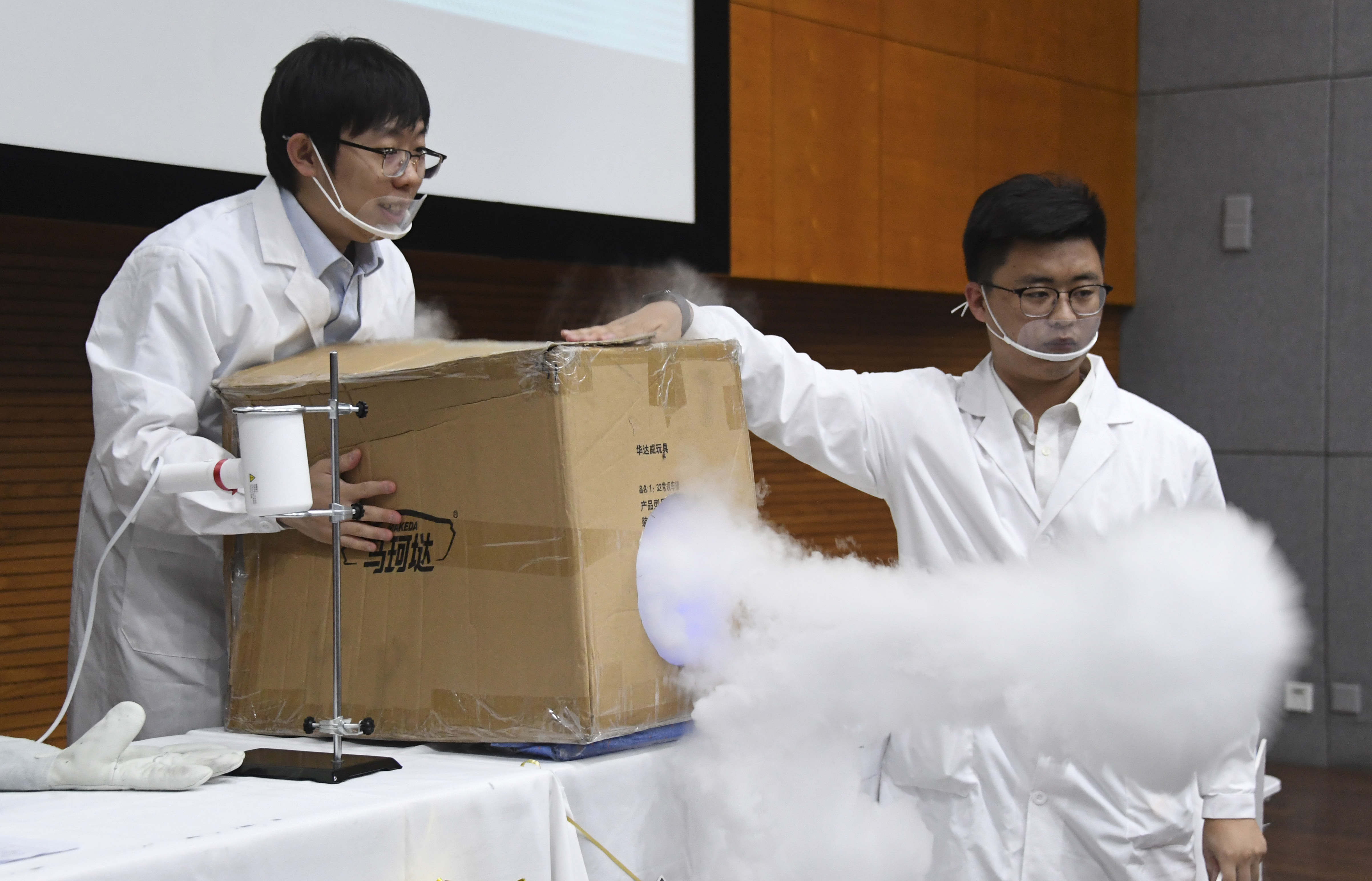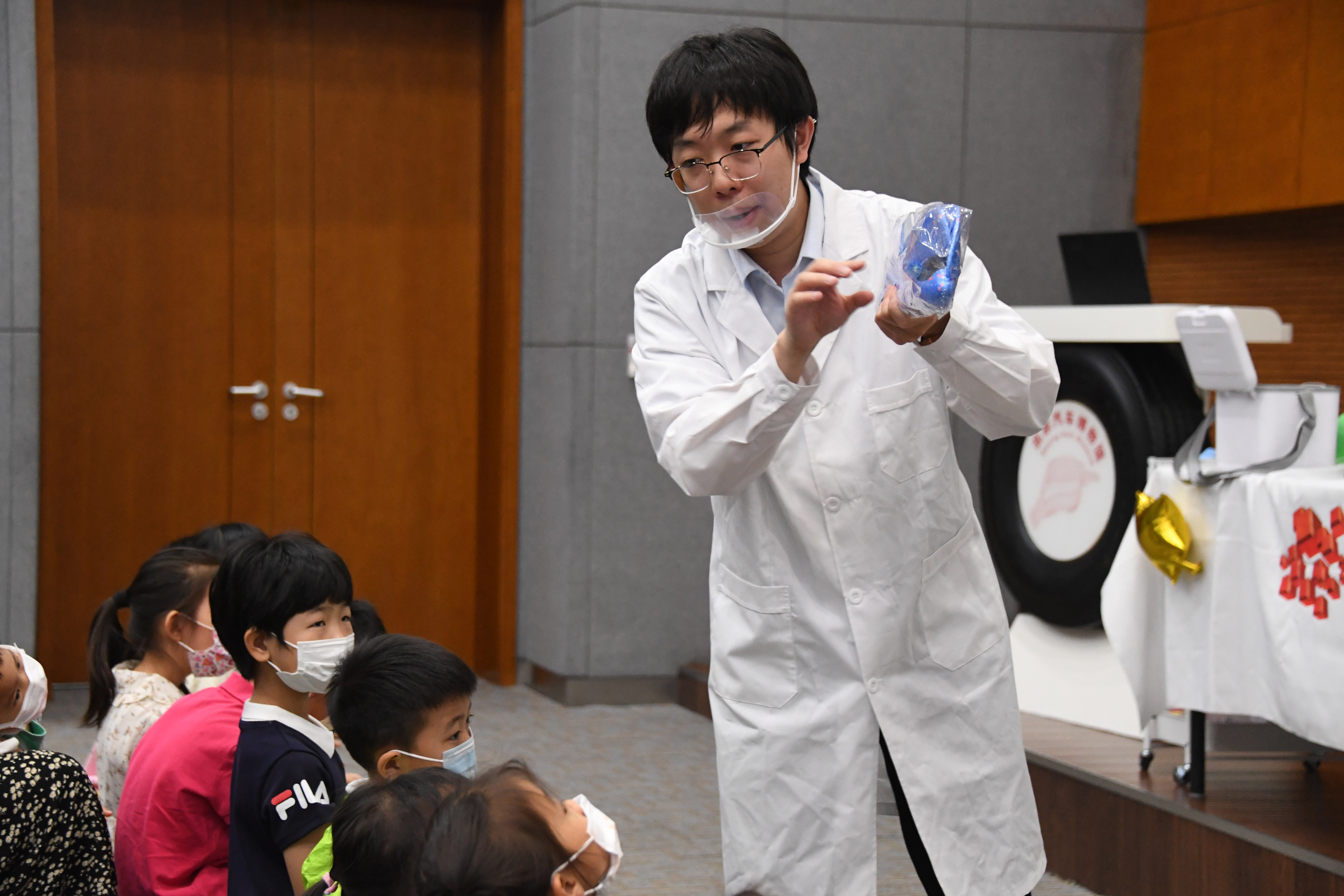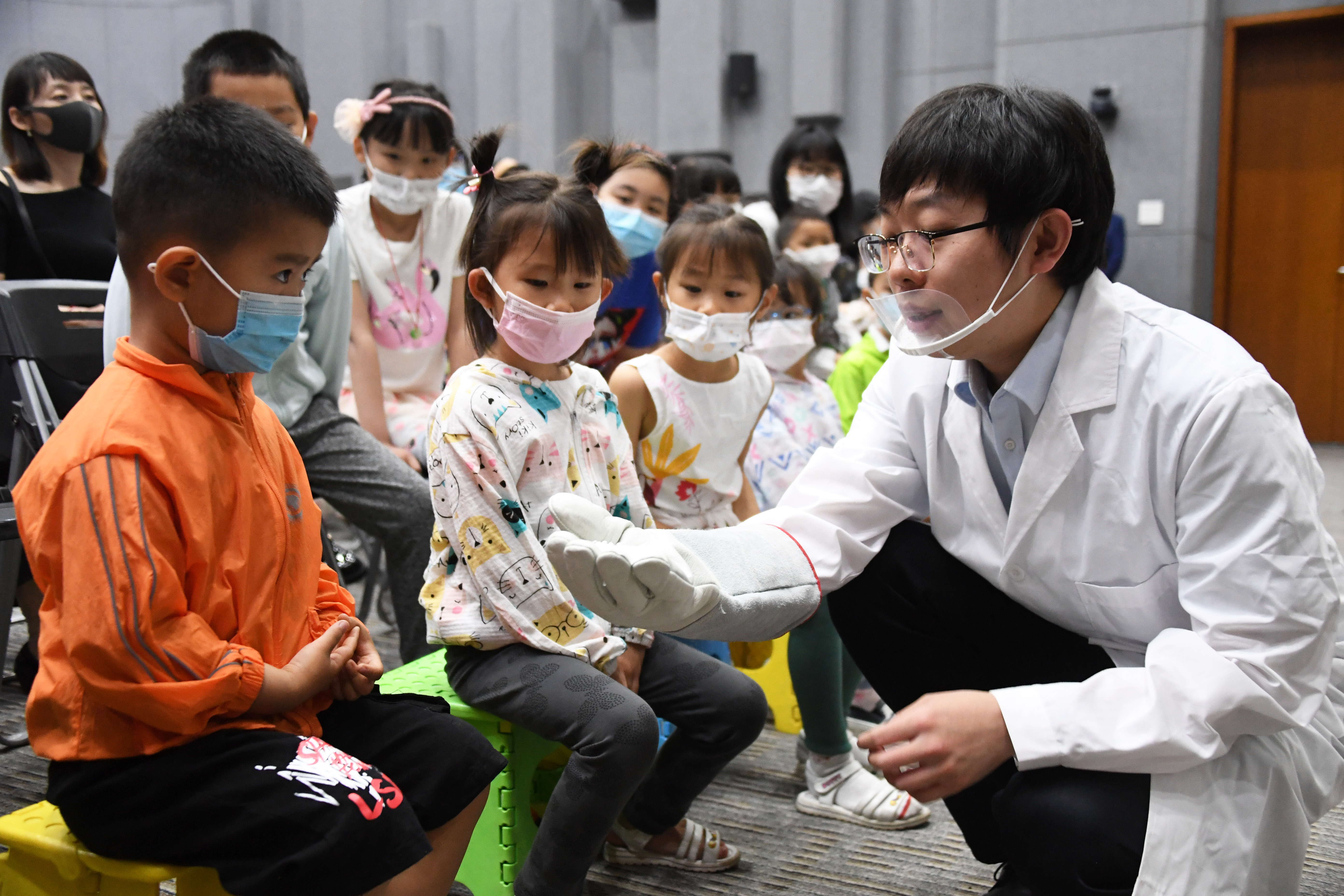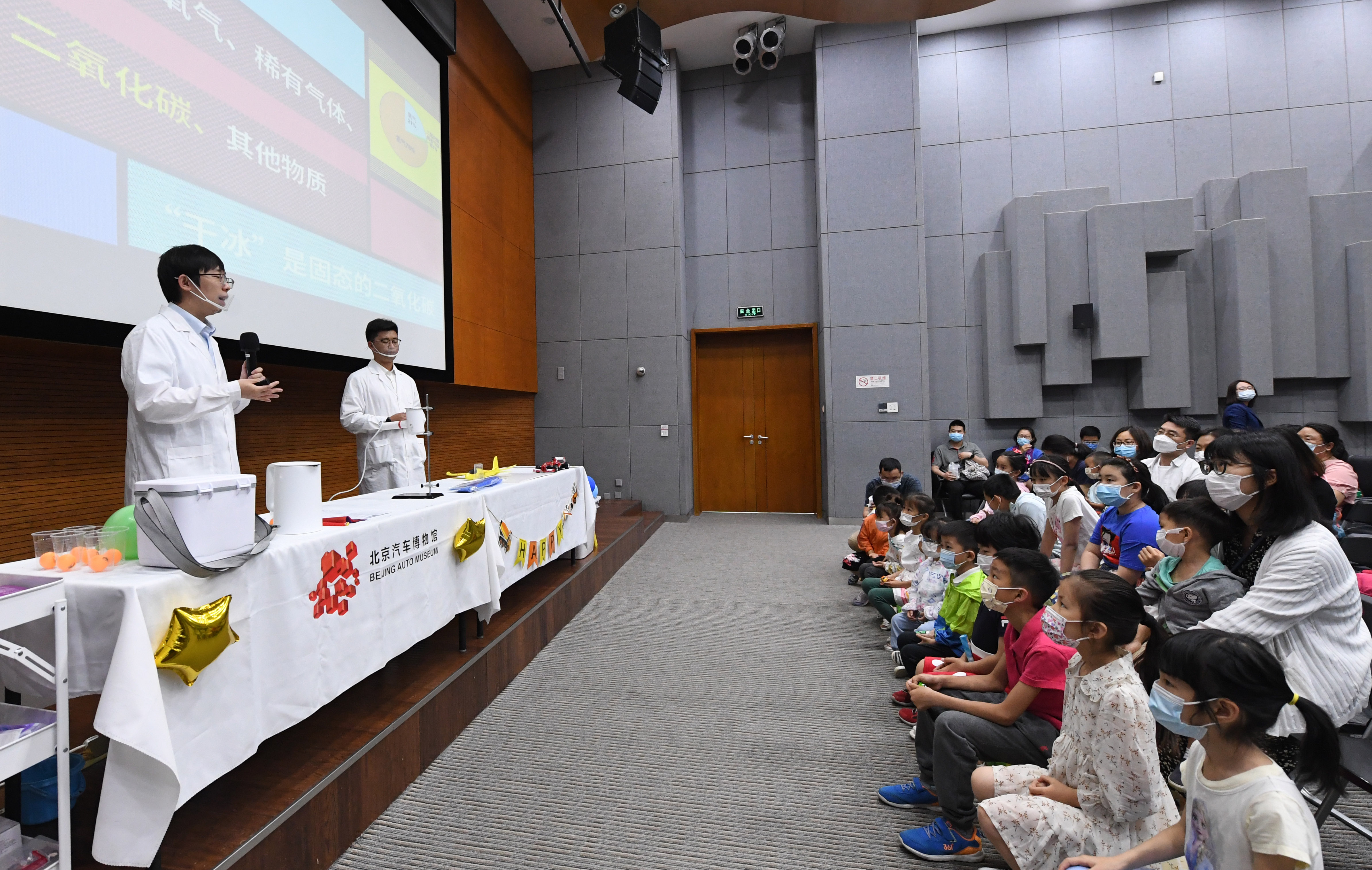 5月30日,工作人员(右一)在“玩转汽车”科普秀中为小朋友展示干冰。